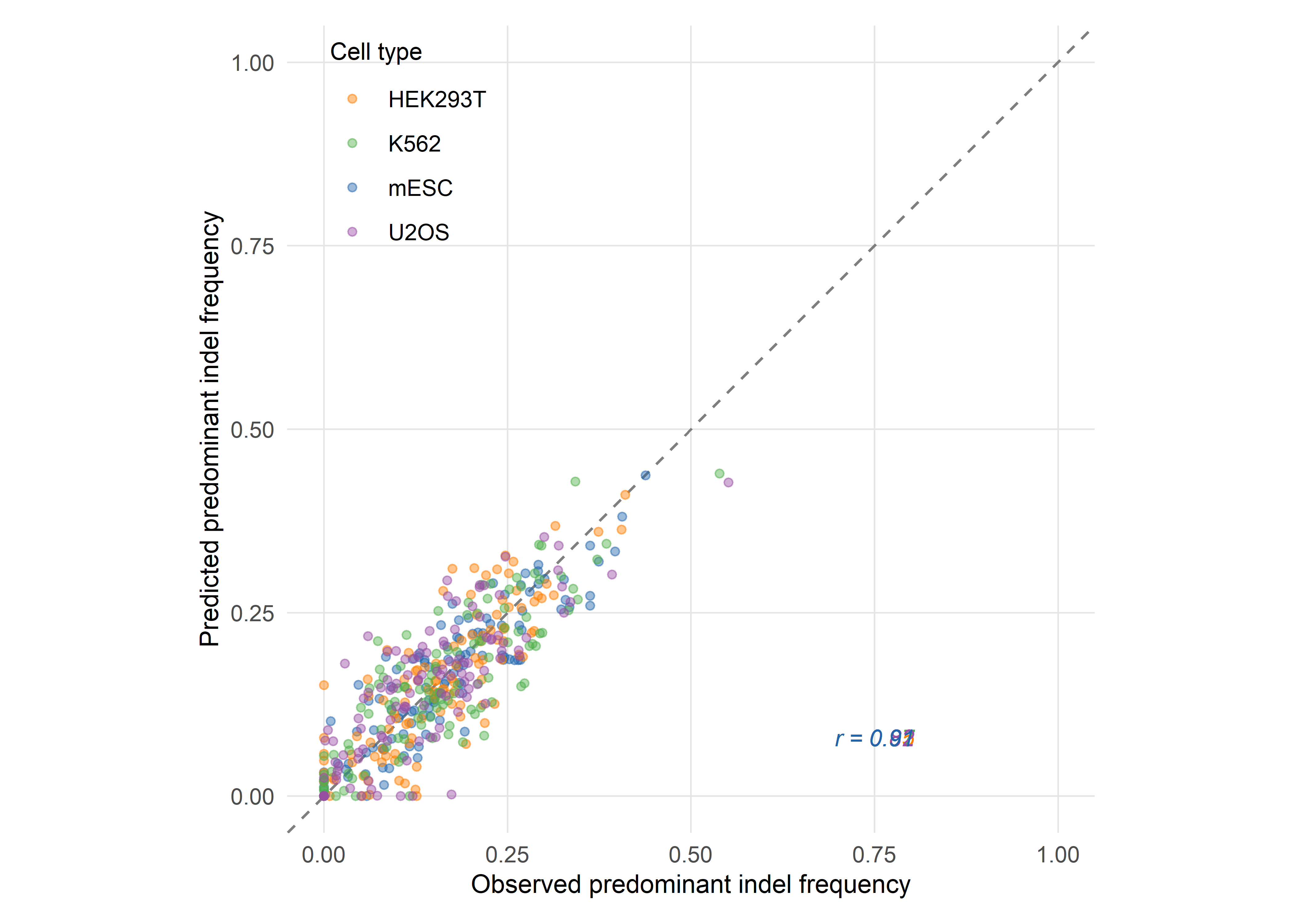 Figure 3.1: Accuracy of repair outcome prediction models across cell types. Each point corresponds to a genomic target site; the x-axis shows the observed frequency of the predominant indel product and the y-axis the model-predicted frequency. Diagonal line indicates perfect prediction. Colour distinguishes cell types (blue: mESC; orange: HEK293T; green: K562; purple: U2OS). Pearson r values for each cell type are annotated. Data are illustrative, based on reported performance ranges from Shen et al. (2018) and Chen et al. (2019).