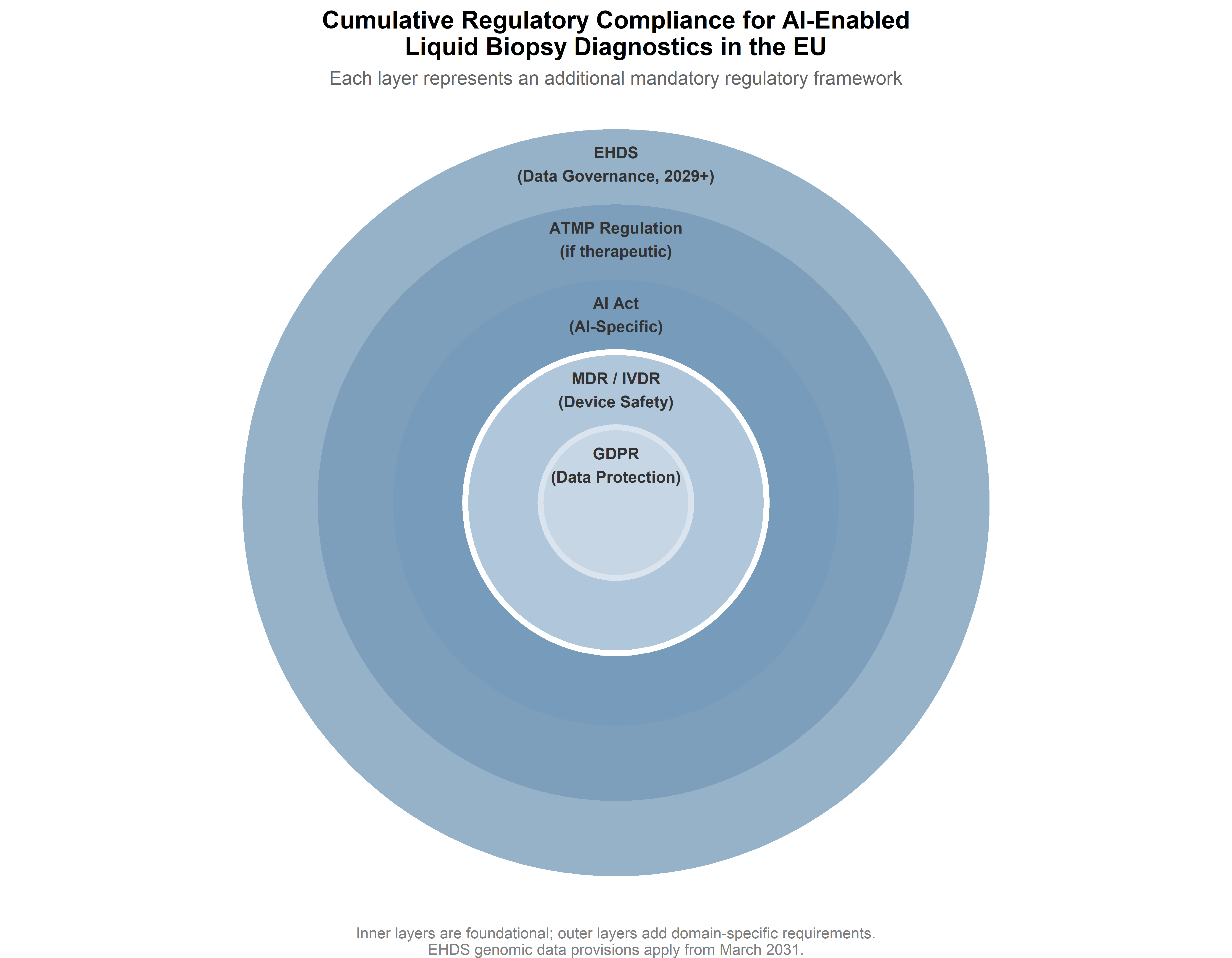 The EHDS also intersects with the AI Act in significant ways. The regulation explicitly addresses the interoperability requirements for EHR systems with medical devices and high-risk AI systems, and mandates consultation between the MDCG, the AI Board, and the European Data Protection Board when common specifications affect products regulated under multiple frameworks. For an AI-enabled liquid biopsy system that processes genomic data from a European Health Data Space infrastructure, the compliance requirements span at least four regulatory frameworks simultaneously: the GDPR (data protection), the EHDS (health data access and interoperability), the MDR/IVDR (device safety and diagnostic accuracy), and the AI Act (AI-specific requirements). The cumulative compliance burden is substantial, and it raises the question—addressed in the STS Interlude below—of whether the cost of regulatory compliance is distributed equitably across different types of research actors.