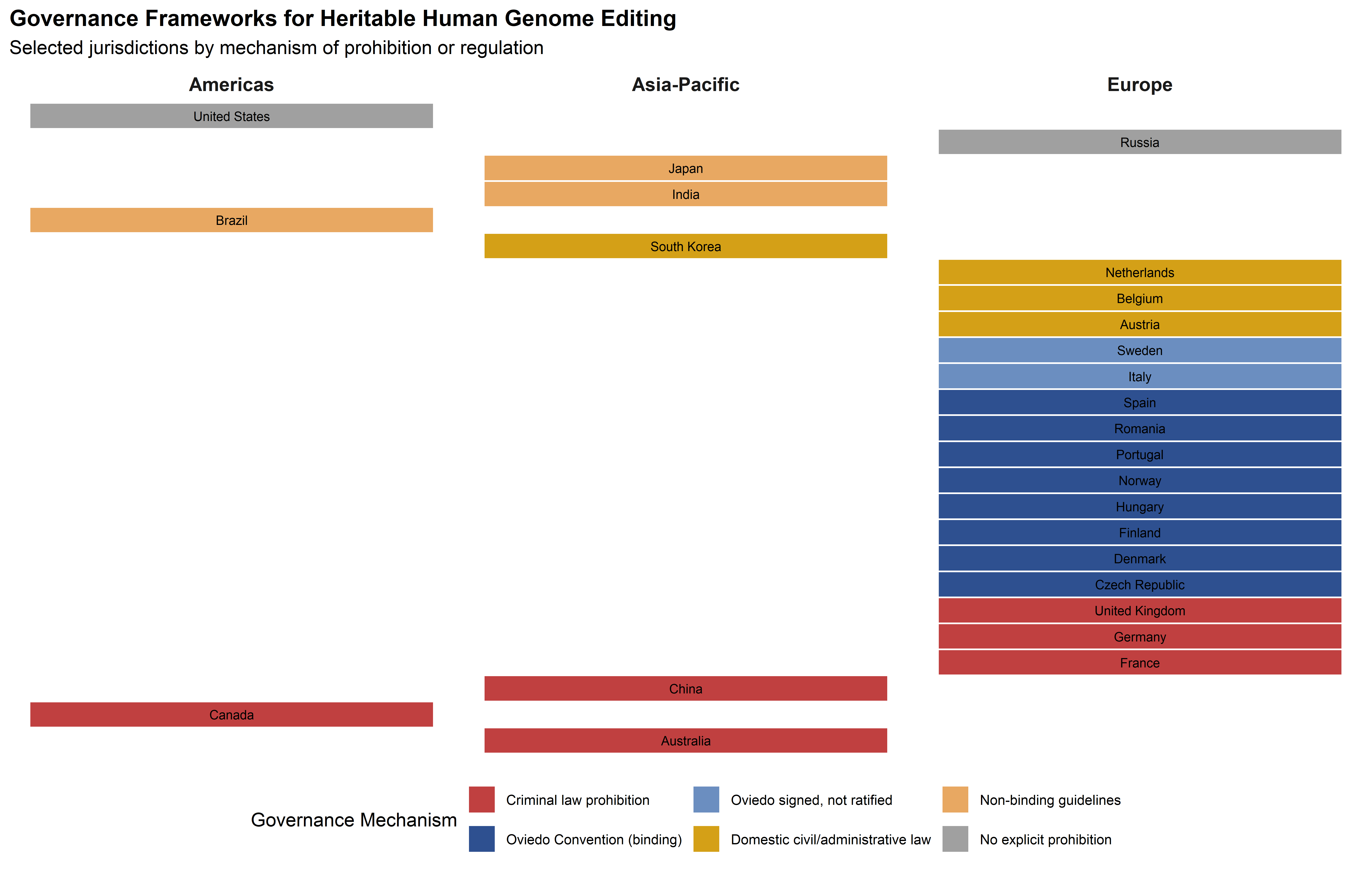 The Oviedo Convention’s prohibition is the only binding international legal instrument addressing heritable genome editing, but it does not cover the entire European governance space, let alone the global one. Germany, the United Kingdom, Austria, Ireland, and several other EU member states have not ratified the Convention—though Germany and the UK prohibit germline modification through domestic legislation (the Embryo Protection Act 1990 and the Human Fertilisation and Embryology Act 1990, respectively) (UK Parliament, 1990). The Netherlands, which had signed the Convention, decided not to ratify it specifically because of the limits it places on embryo research, though it maintains a national prohibition on reproductive germline modification.