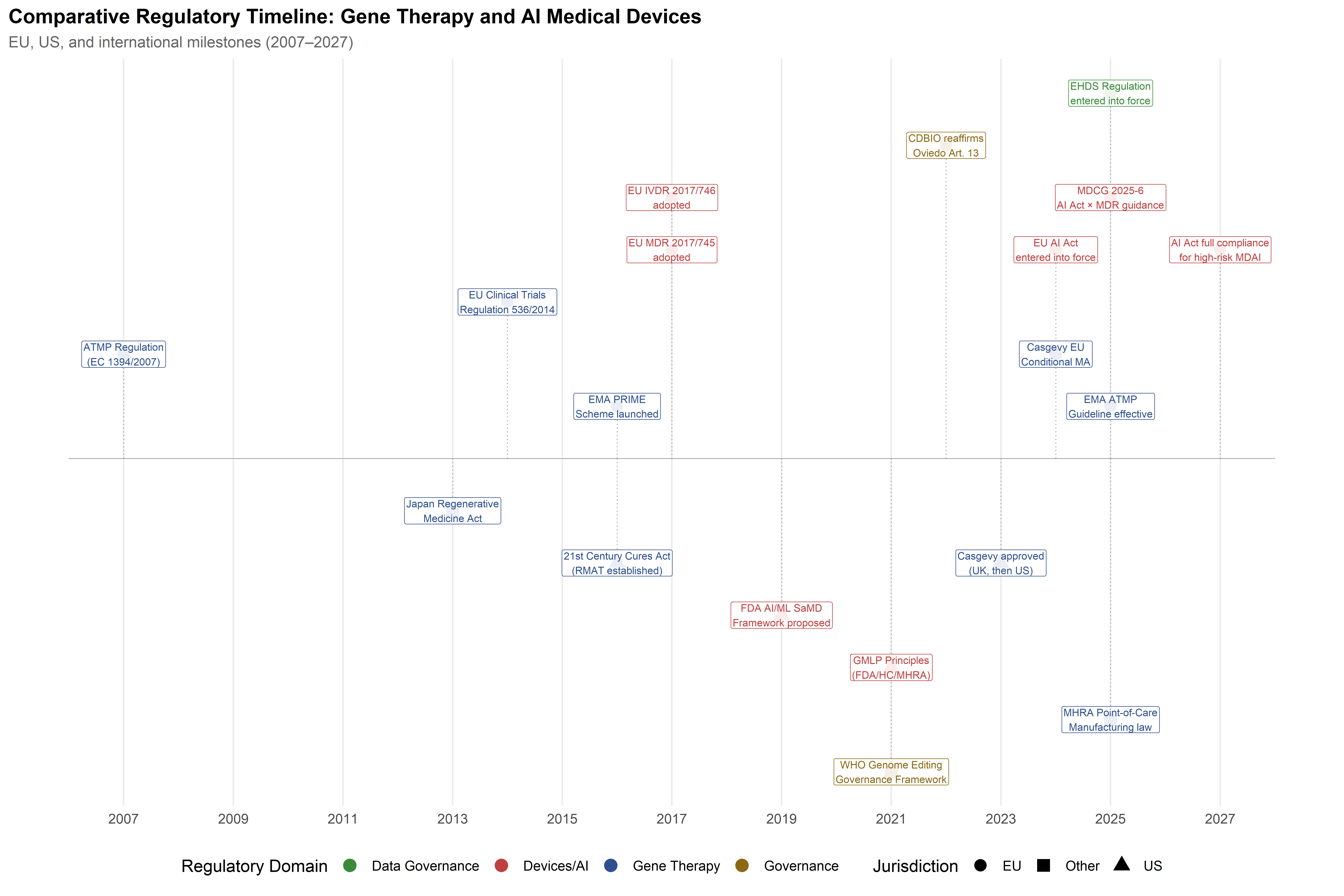 The governance challenges exposed by that approval are multiple and entangled. Technological development has outpaced the review capacity of agencies designed for conventional pharmaceuticals. The dual-use character of CRISPR spans from somatic therapies for monogenic diseases—broadly accepted—through heritable germline modifications prohibited under the Oviedo Convention and most national frameworks, to enhancement applications that remain speculative and largely unregulated. Meanwhile, the integration of AI into the development pipeline and into the diagnostic architecture supporting gene editing—visible in the PREDI-LYNCH liquid biopsy platform discussed in Chapter 6—introduces a second, intersecting regulatory domain with its own rapidly evolving framework, most notably the EU AI Act.