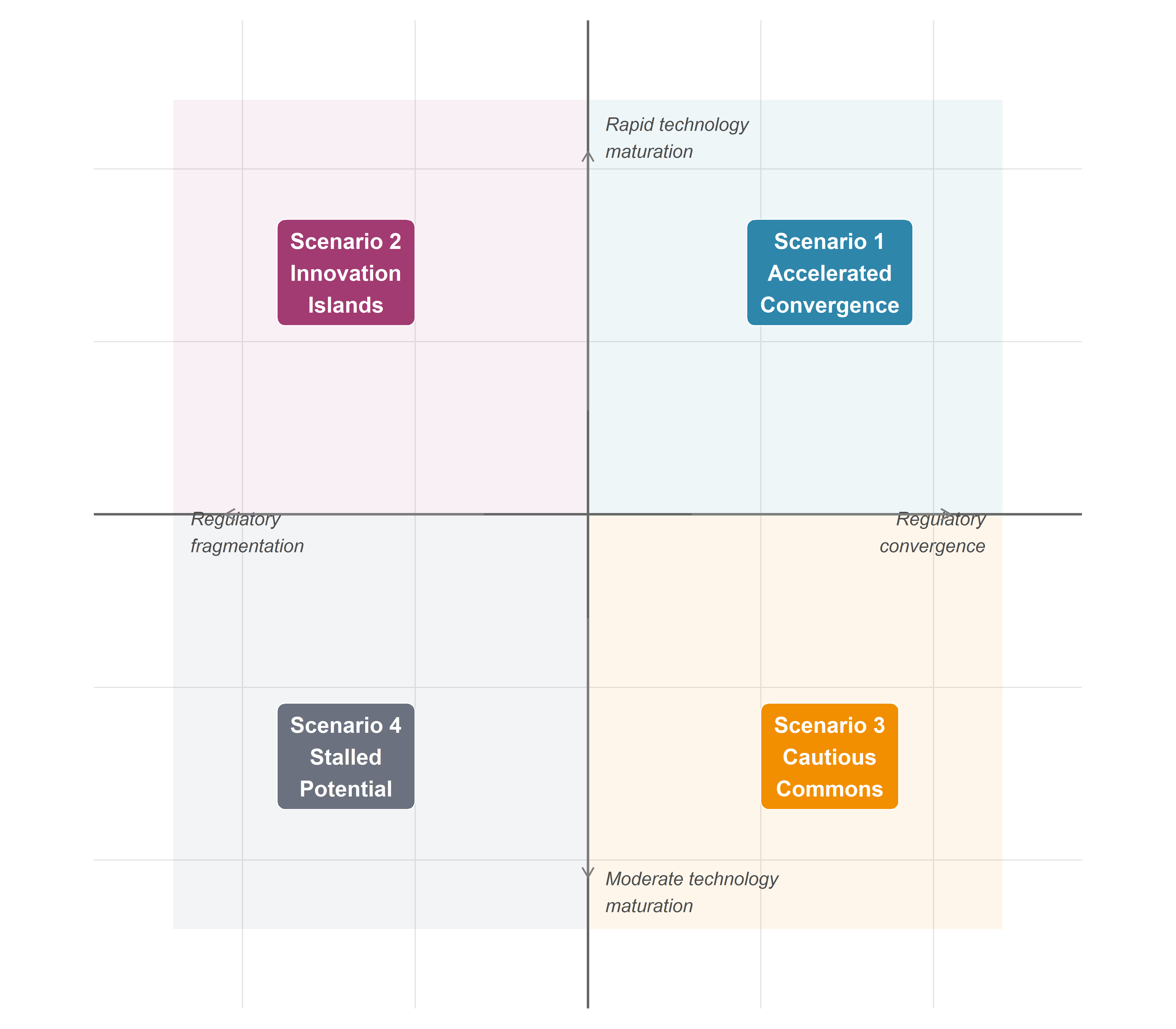 | Moderate technology maturation | Scenario 3: Cautious Commons | Scenario 4: Stalled Potential |