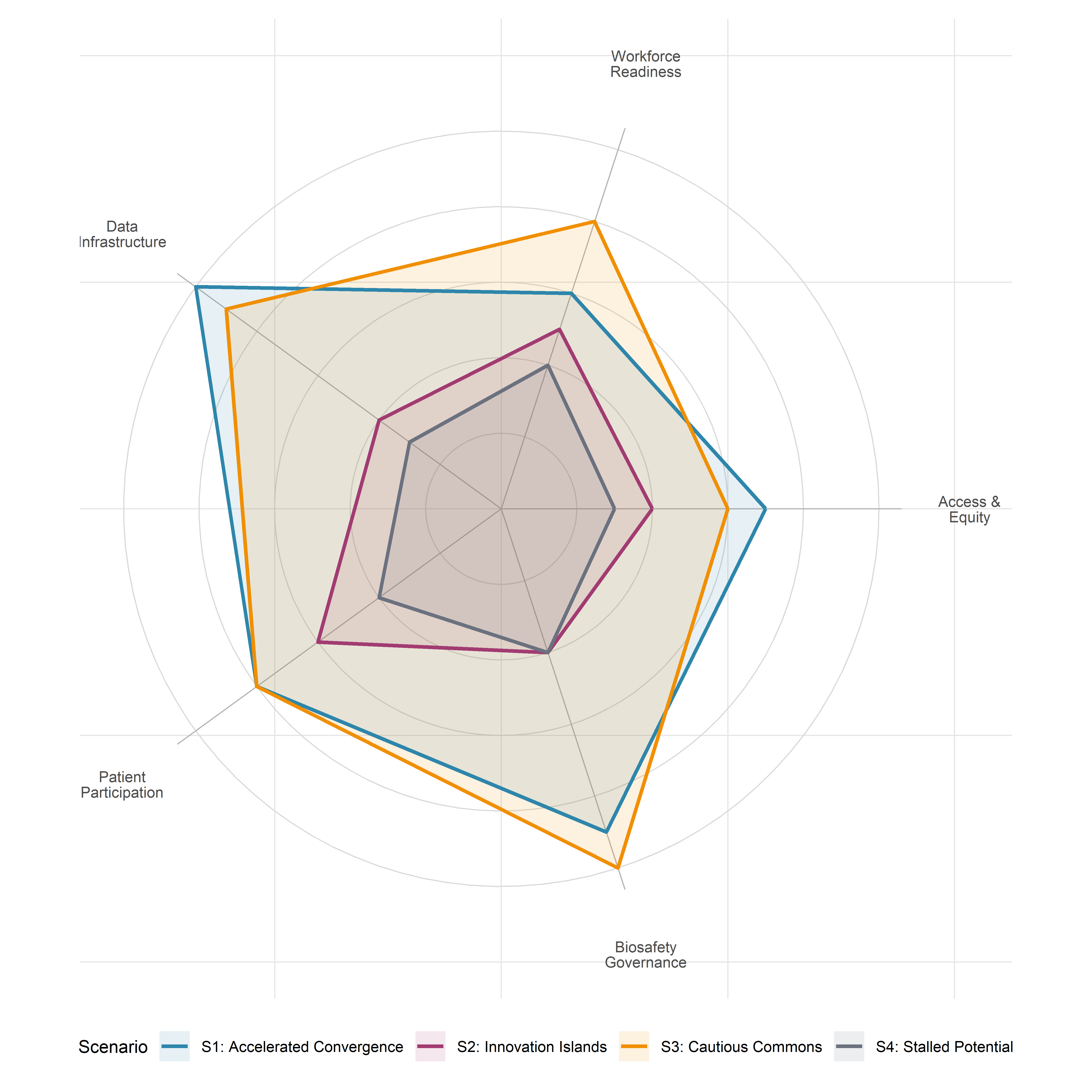 A scenario-matrix methodology structured around two axes—technology maturation rate and regulatory-governance coordination—yields four contrasting futures (Accelerated Convergence, Innovation Islands, Cautious Commons, Stalled Potential) whose cross-cutting analysis identifies access, workforce capacity, data infrastructure, patient participation, and biosafety as decisive variables regardless of which path materialises. Programme resilience across these futures depends less on the accuracy of any single forecast than on modular research design, integrated normative analysis, and the structural embedding of participatory governance.