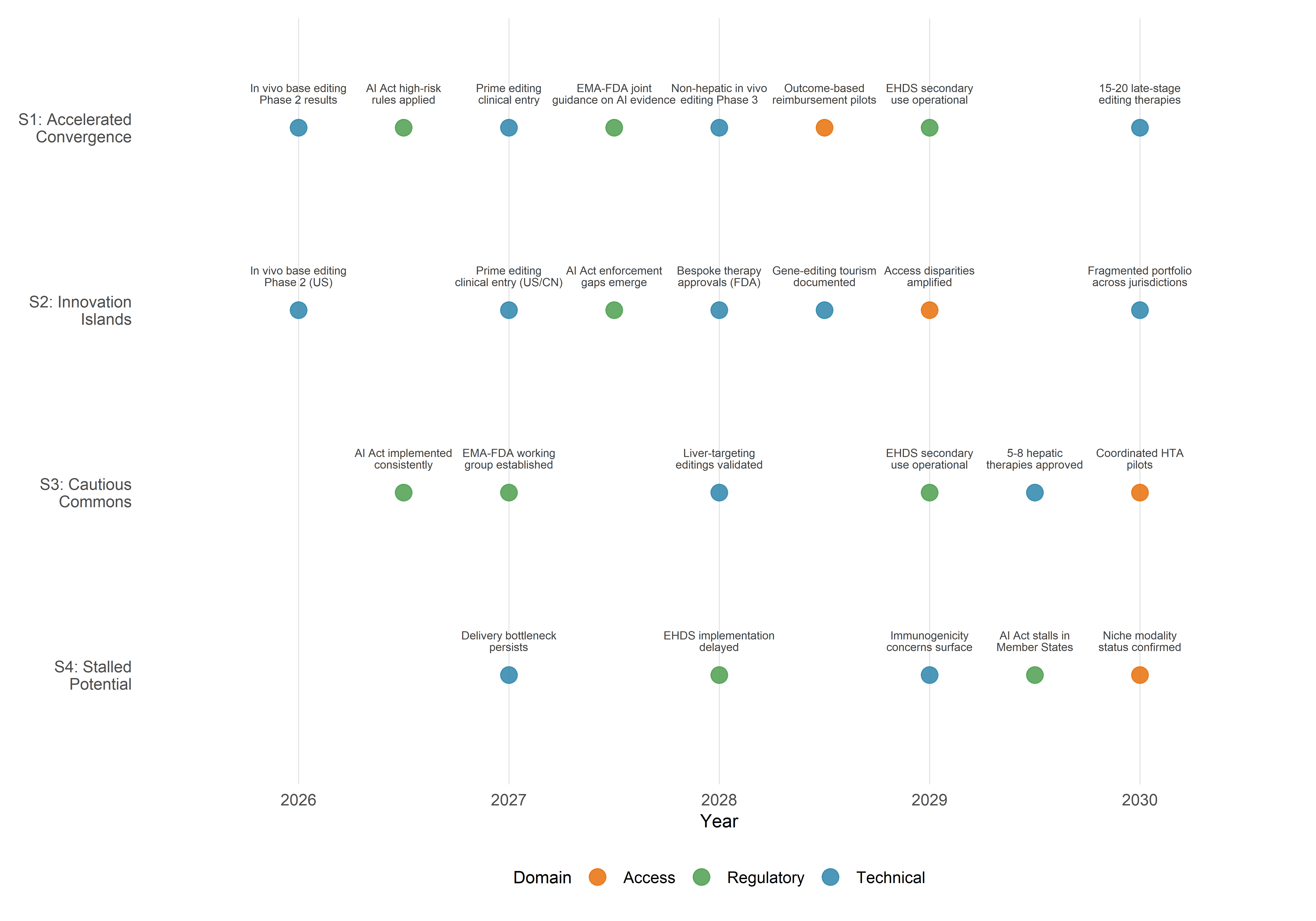 In January 2024, a single CRISPR-based therapy—Casgevy, for two haemoglobinopathies—had just received its first regulatory approval. By early 2026, the clinical pipeline had expanded to over 250 registered gene-editing trials, base editors had achieved in vivo correction of disease-causing mutations for the first time, and the first personalised CRISPR therapy had been administered to an individual patient. What will the field look like in 2030? No honest answer to that question takes the form of a prediction. Prediction requires models whose parameters can be estimated with reasonable precision—a condition manifestly unmet in a domain shaped by contingent regulatory decisions, unpredictable scientific breakthroughs, and shifting geopolitical alignments. What can be offered instead is scenario analysis: a systematic exploration of plausible futures conditioned on identifiable drivers and uncertainties, designed not to forecast outcomes but to expand the deliberative imagination of researchers, regulators, clinicians, and publics (Heijden, 2005; Schwartz, 1991).